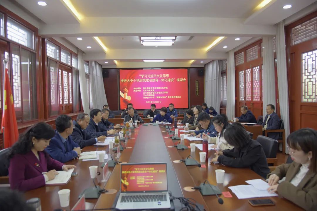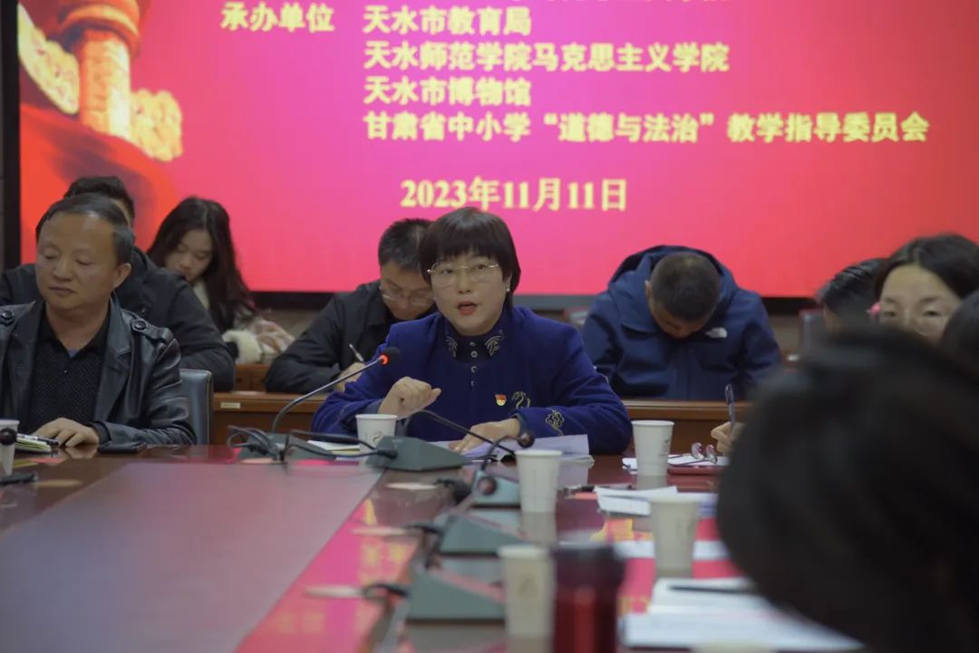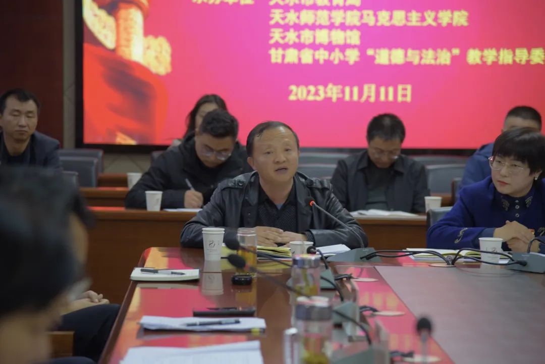 11月11日下午,由西北师范大学365英国上市集团、天水市教育局、天水师范学院365英国上市集团、天水市博物馆、甘肃省中小学“道德与法治”教学指导委员会共同举办的“学习习近平文化思想 推进大中小学思想政治教育一体化建设”座谈会在天水市博物馆畅和轩会议室隆重召开。西北师范大学365英国上市集团党委书记刘德雄、院长史小宁、党委副书记王宏渊,天水师范学院365英国上市集团党委书记刘建军,天水市教育局党组成员、总督学张永蔚,天水市博物馆党总支副书记、副馆长崔文刚等领导参加会议。