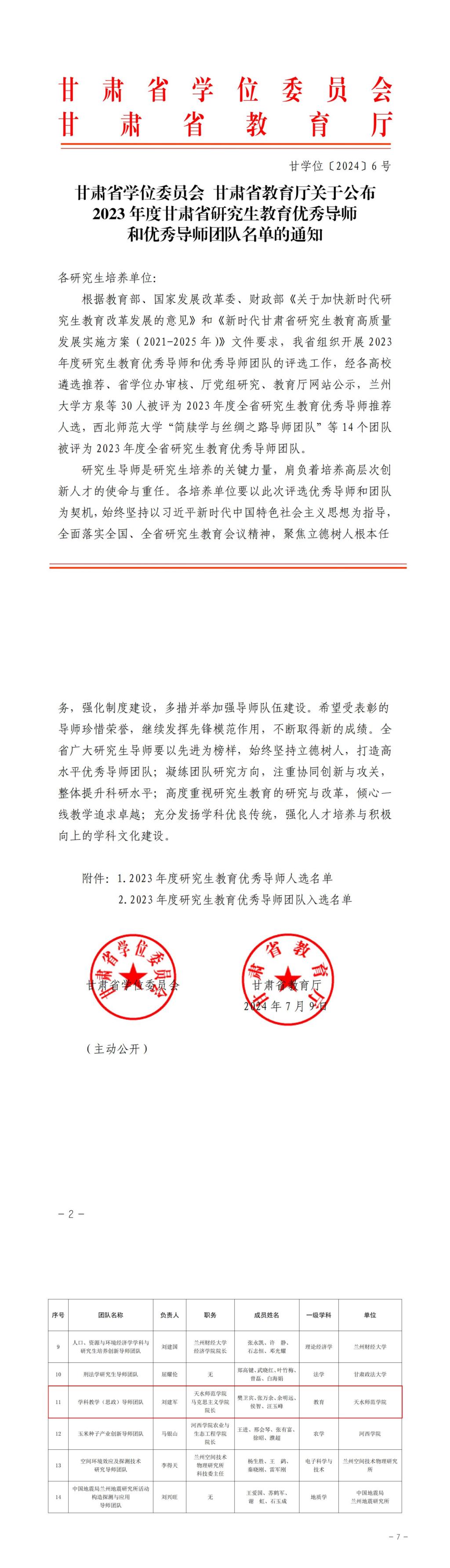 近日,甘肃省学位委员会、甘肃省教育厅公布了2023年度甘肃省研究生教育优秀导师和导师团队评选结果。全省共有30位研究生导师和14个研究生导师团队入选。