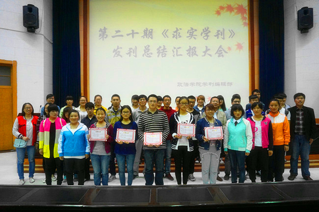 2015年4月27日晚,政法学院学生刊物《求实学刊》第二十期总结汇报大会在学校二号报告厅召开。会议由《求实学刊》副主编马伟鹏同学主持,政法学院副院长刘建军老师、辅导员陈春晖老师及一、二、三年级思想政治教育与法学专业全体学生参加了本次会议。