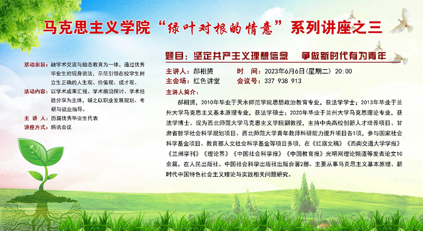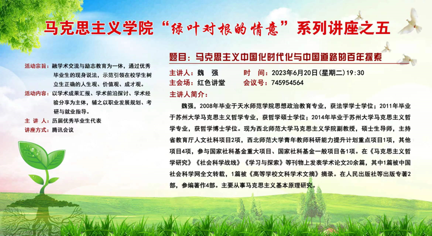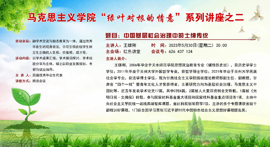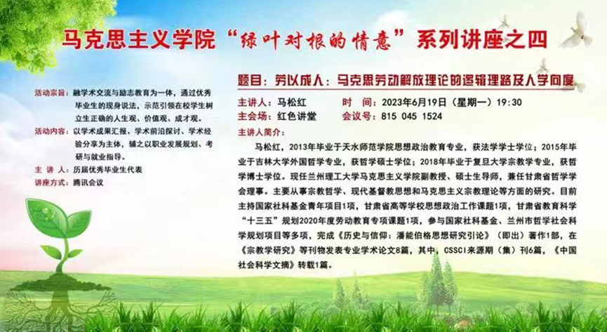 活动邀请李靖(一级美术师、天水美术馆馆长、天水书画院院长)、刘华荣(博士、兰州交通大学副教授)、王雄刚(博士、甘肃社会主义学院副教授)、郝相赟(博士、西北师范大学副教授)、马松红(博士、兰州理工大学副教授)、魏强(博士、西北师范大学副教授)等六位优秀毕业生代表现身说法,分享他们的成长经验、学术成果,并就如何科学制定职业发展规划、如何有效地进行专业学习、如何增强自己的就业竞争力、如何选择考研方向及备考等问题,与在校学生进行了深入细致地交流,充分发挥自身示范引领作用。
