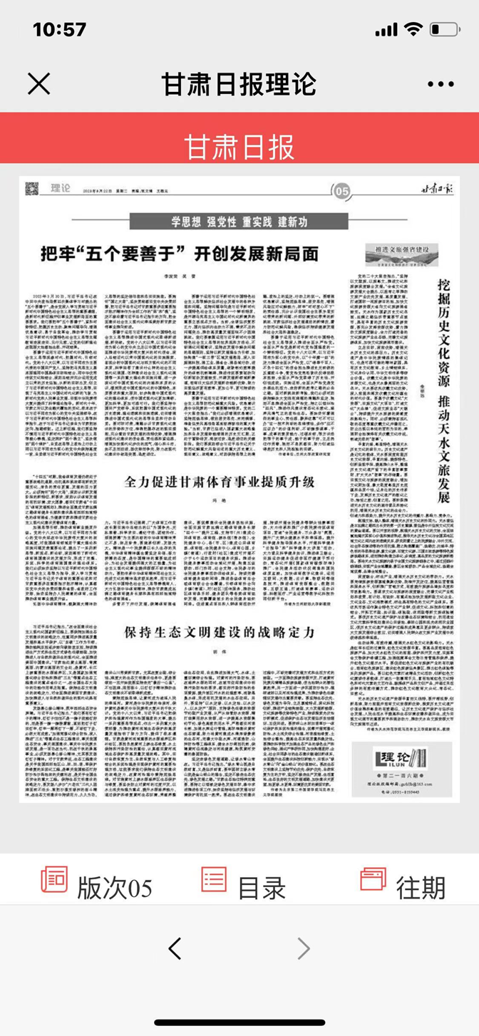甘肃省思想政治理论课名师工作室主持人余明远教授遵循党的二十大报告提出的“坚持以文塑旅、以旅彰文,推进文化和旅游深度融合发展”的战略任务,根据调查研究,于2023年8月22日在《甘肃日报》理论版发表了题为“深挖历史文化资源,推动天水文旅发展”的文章,主要包括:立足实际,深挖优势,增强天水历史文化的感召力;丰富内涵,彰显特色,增强天水历史文化的吸引力;梳理文脉、融入整体,增强天水历史文化的协同力;深度融合,衍生产业,增强天水历史文化的带动力;生动诠释,有效传播,增强天水红色文化的影响力。