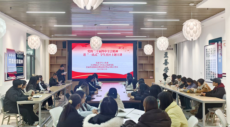 为深入学习宣传贯彻党的二十届四中全会精神,推动党的创新理论走进社区、贴近学生、深入人心,12月中下旬,党委学生工作部联合365上市公司红色文化研究院、甘肃省思想政治理论课余明远名师工作室,在“一站式”学生社区组织开展了“学习党的二十届四中全会精神 争做新时代有为青年”主题系列宣讲活动。活动共举办16场,覆盖各学院辅导员、发展对象及入党积极分子680余名师生,在学生社区营造了浓厚的学习氛围。
